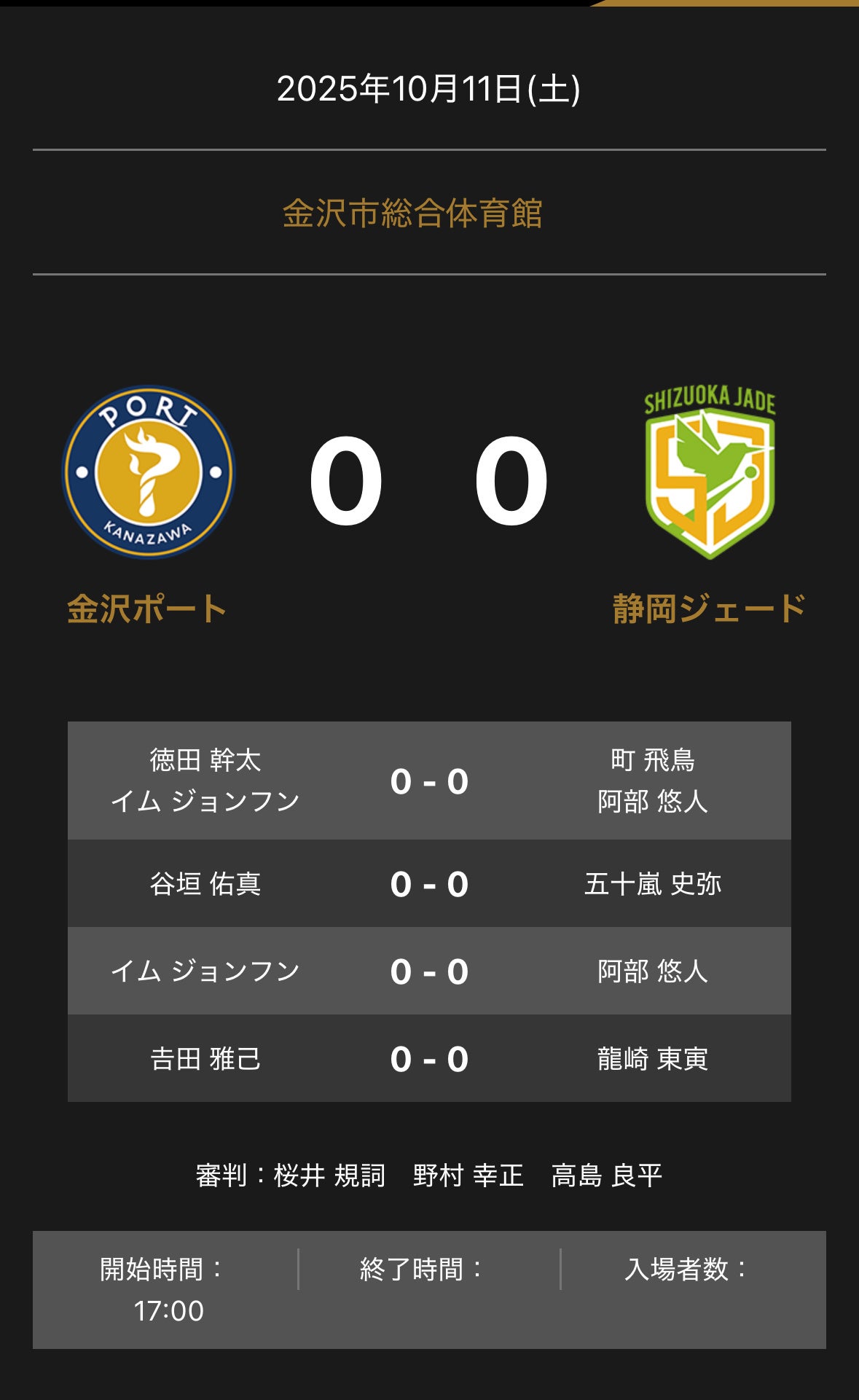 ノジマTリーグ 2025-2026 公式戦 10月11日開催 金沢ポート vs 静岡ジェード対戦オーダーを発表いたします。