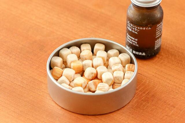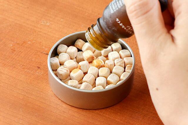 手のひらサイズの缶を開けると、中にはウッドチップのような小さな木片が入っています。