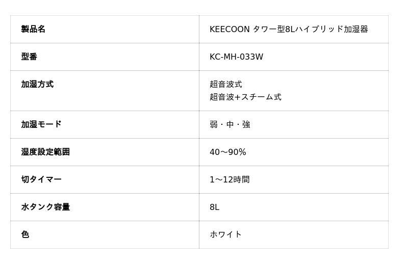 KEECOON タワー型8Lハイブリッド加湿器(KC-MH-033W)は11月に新規販売予定