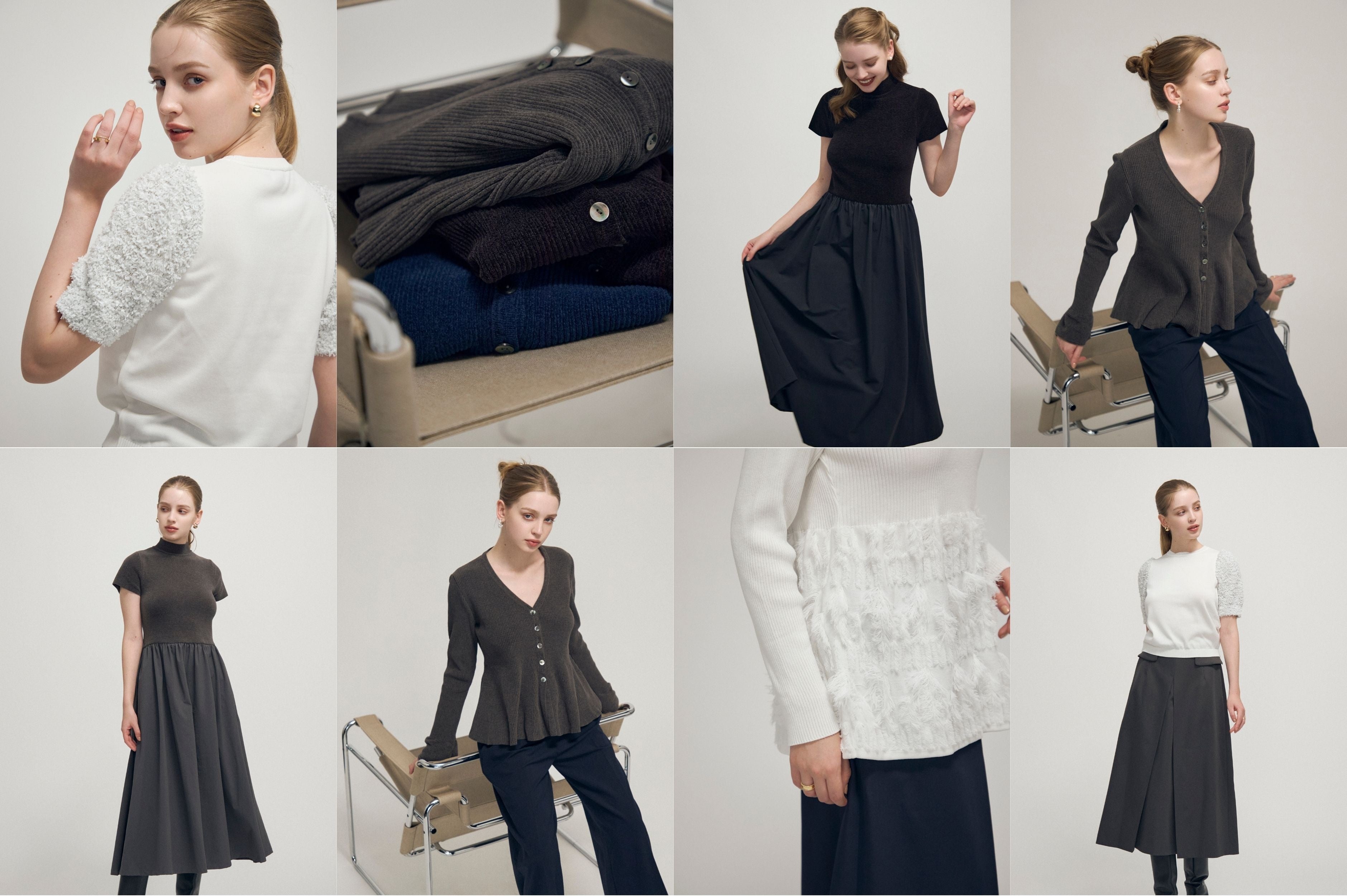 昨年のコレクションで大人気となった”半袖ニット”に続き、今年も繊細でやわらかい雰囲気を纏ったニュアンスカラーの五部袖トップスや、ベロアのような光沢感で1枚で”着映え”するワンピースとカーディガンのセットアイテムなどが揃います。