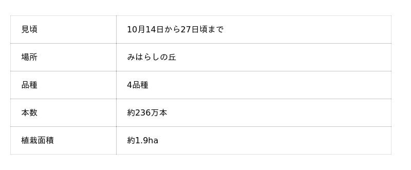 今年はコキア紅葉見頃とコスモスの見頃を合わせるため、大輪で開花の早い品種「センセーション」を昨年の7割から9割へ増やしました。また、遅咲き品種の「秋咲き大輪」を植栽しており、できるだけ長い期間コスモスをお楽しみいただけるよう工夫しています。そのため、丘を縁取るように咲き誇るコスモスと、丘一面を真っ赤に染め上げるコキアとの共演をご覧いただけます。