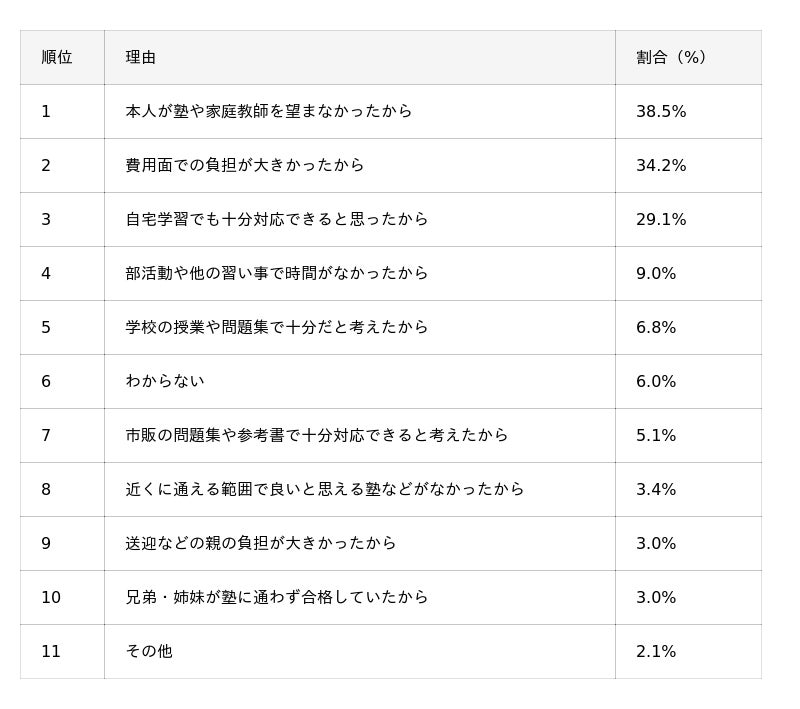 「本人が望まなかった」が38.5%で最多、次いで「費用面の負担」が34.2%。約3割は「自宅学習で十分」と回答し学習スタイルの多様化も浮き彫りに。変化するZ世代の価値観と、家庭の教育方針のリアル
