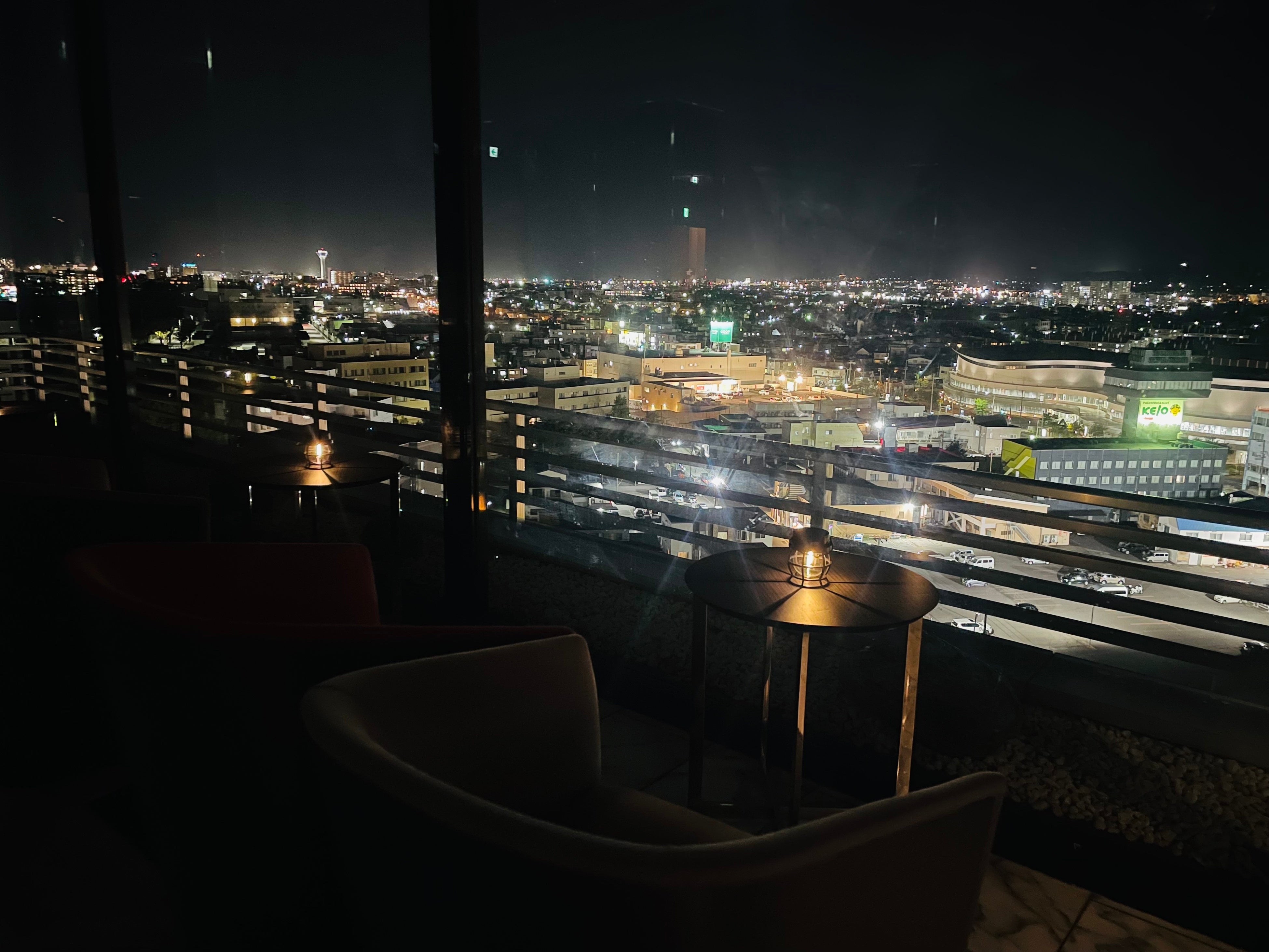 湯の川温泉地区で最上階に位置するラウンジから函館の街なみを眺め、フリードリンクを片手に、