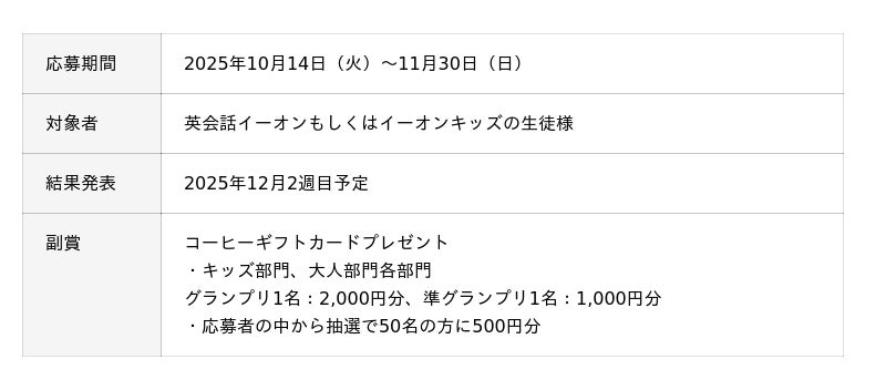 英会話教室を運営する株式会社イーオン(本社:東京都新宿区、代表取締役社長:重野卓、以下「イーオン」)は、イーオン、イーオンキッズにお通いの生徒様を対象に、2025年10月14日~11月30日の期間中、様々なエピソードとともに2025年を象徴する英単語を募集します。2024年には応募総数は477件と好評であったことから2回目の実施を決定いたしました。本企画の目的は、1年を振り返りエピソードやご自分の気持ちを表す単語を探す過程で、多くの英単語に触れて楽しみながら学んでいただくことです。