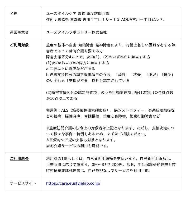 「すべての必要な人に、必要なケアを届ける。」をミッションに、重い障害や難病のある方に重度訪問介護事業を中心とした包括的介護福祉サービスを全国に届けるユースタイルラボラトリー株式会社(本社:東京都中野区、代表取締役:大畑健)は、2025年10月1日、当社として青森県初となる重度訪問介護サービス事業所「ユースタイルケア 青森 重度訪問介護」事業所を開設しました。