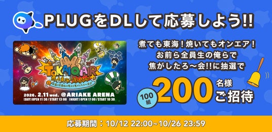 【キャンペーン名】『PLUG』をダウンロードして「煮ても東海!焼いてもオンエア!お前ら全員生の俺らで焦がしたろ~会!!」チケットプレゼントキャンペーン【応募期間】2025年10月12日(日)22:00 ~ 2025年10月26日(日)23:59(JST)