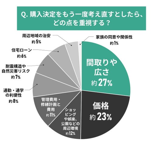 約27%が「間取りや広さ」を最も重視すると回答しており、実際の生活を経験した上で間取りの重要性を再認識していることがわかります。次いで「価格」が約23%と続き、コスト面への意識も高いことが明らかになりました。