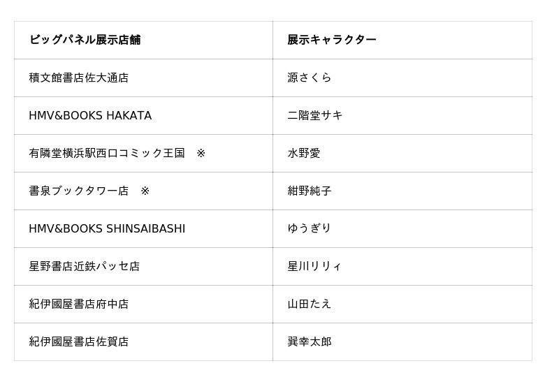 キャンペーン開催書店のうち8店舗では、「フランシュシュ」メンバーとプロデューサー巽幸太郎の描き下ろしイラストを使用した、書店店頭でしか見ることができないオリジナルビッグパネルを展示します。さらに、「有隣堂横浜駅西口コミック王国」と「書泉ブックタワー店」の2店舗では、店外にビッグポスターを掲示します。