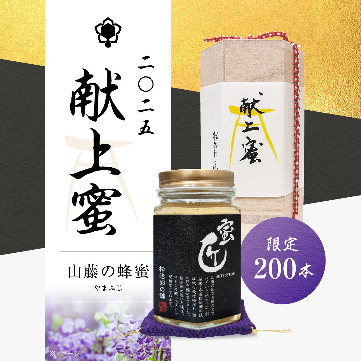 株式会社松治郎の舗(本社:三重県松阪市、代表取締役:水谷俊介)は、2025年10月15日(水)より伊勢神宮の神嘗祭(かんなめさい)に、今年取れた様々なはちみつの中から極上品として選ばれた「山藤のはちみつ」を奉納いたします。この「山藤のはちみつ」を180gの瓶に詰め、『献上蜜』という名称で、お歳暮時期より順次限定約200本を販売いたします。