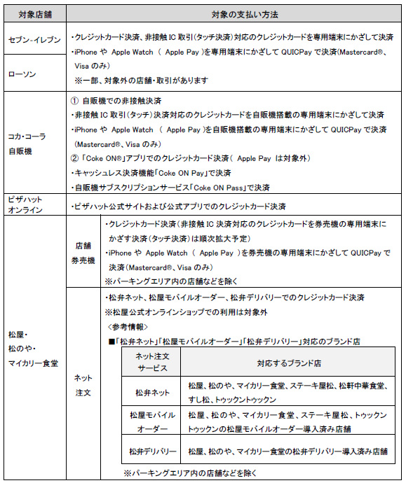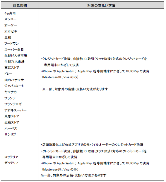 セブン‐イレブン、ローソン(ナチュラルローソン、ローソンストア100を含む)、コカ・コーラ自販機(タッチ決済、QUICPay、Coke ON(R))、くら寿司、スシロー、ピザハットオンライン、松屋、松のや、マイカリー食堂、オーケー、オオゼキ、三和、フードワン、スーパー魚長、生鮮げんき市場、生鮮乃木市場、東武ストア、ドミー、肉のハナマサ、ジャパンミート、ヤマナカ、フランテ、フランテロゼ、ロッテリア、ゼッテリア、アオキスーパー、東急ストア、近商ストア、ハーベス、サンリブ