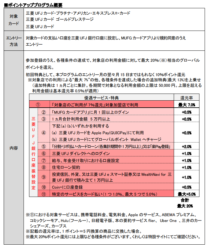 三菱UFJニコスはこの度、「三菱UFJカード」の個人会員向けに提供する、業界最高水準の最大20%還元の「ポイントアッププログラム」において、対象店ごとの利用金額で貯まるスペシャルポイントの算出方法を、全対象店の金額を合算する方式に改め、また、同時にポイント適用条件の最低利用額1,000円単位を廃止とし、10月16日以降の利用分から適用します。