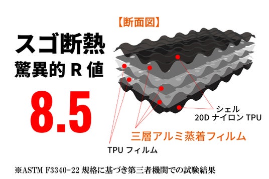 このようにR8.5という高断熱性能は、氷点下を下回るような環境や雪中キャンプなど、厳しい自然条件下でも安心して使用できるスペックを備えている証拠になります。