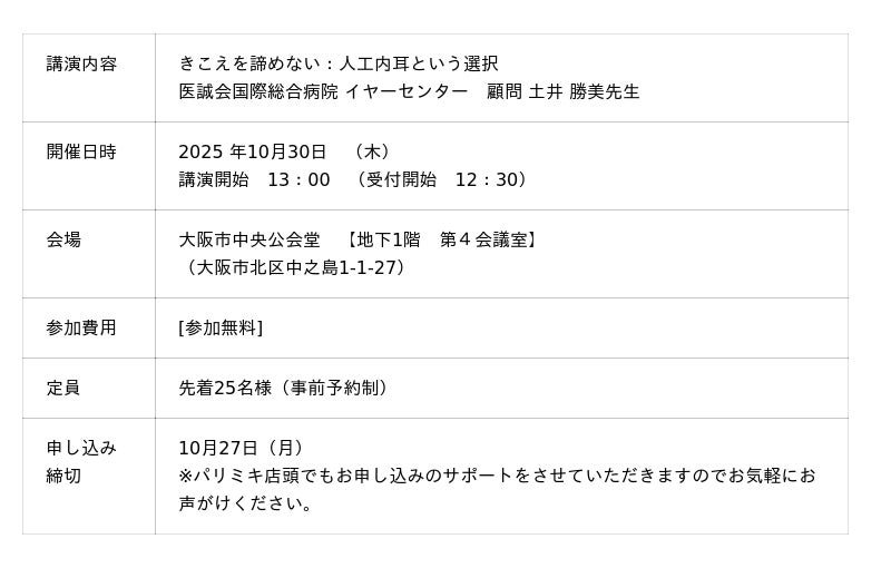 この度、株式会社 日本コクレア(執行役員社長:上中茂弘、以下「日本コクレア」)は、きこえに関するサポートを提供する活動の一環として、全国に補聴器店を展開する株式会社 パリミキ(本社:東京都港区、代表取締役社長:恒吉裕司、以下「パリミキ」)と共催にて、10月30日(木)難聴と難聴医療の選択肢についての市民講座を開催いたします。