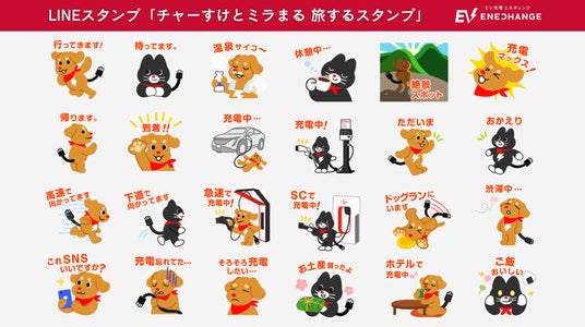 名前決定を記念し、LINEスタンプ「チャーすけとミラまる 旅するスタンプ」の販売を開始しました。EVでの旅行やドライブをテーマに、24種類のスタンプで日常のコミュニケーションを楽しく彩ります。