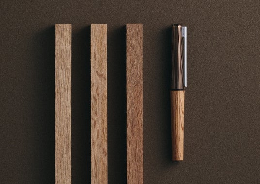 木軸モデルには、神聖な木という意味の「イチカシ」が転訛(てんか)してその名がついたと言われる「イチイガシ」を採用しました。カシの中でも大きく育つイチイガシは、肥沃(ひよく)な大地の象徴とされ、悠然と構えるその姿と相まって、古くから信仰を集めてきた由緒ある木です。古来より続く「書くこと」への敬意をこめて選定しました。「イチイガシ」の特徴である「虎斑(とらふ)」と呼ばれる、虎の縞模様を思わせる縞状の木目が、木ならではの魅力を引き立てます。カリモク家具株式会社(以下、カリモク家具)の高精度な加工技術と熟練の職人による不規則な切削痕を加えることで工芸品のような質感を再現しました。キャップには、樹皮を思わせる細い溝を刻む「シェーパーカット」を施し、自然の不揃いな美しさを表現しています。すべてのモデルにシリアルナンバーを刻印し、1,000本の数量限定で販売します。初期のリフィルは「ファインライター」をセットしています。