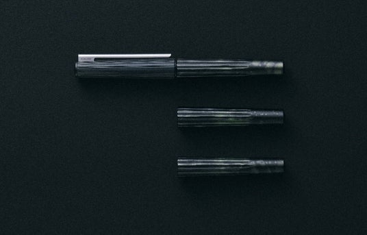 金属軸モデルは、ゆるやかに重なり合い、溶け合う色彩を表現したモスマーブルがテーマになっています。ベースとなる胴軸は、苔が長い年月をかけて育っていく姿をモチーフにしたモスグリーンで仕上げられており、その上に施された特殊なアルマイトの加工によって、一本ごとに表情の異なるマーブル模様が浮かび上がります。キャップには「シェーパーカット」によるランダムな溝を彫刻し、胴軸には揺らぎを感じさせる切削痕をプログラムで再現しました。木軸モデル同様シリアルナンバー入りで限定2,000本の数量限定で販売します。初期のリフィルは「ファインライター」をセットしています。