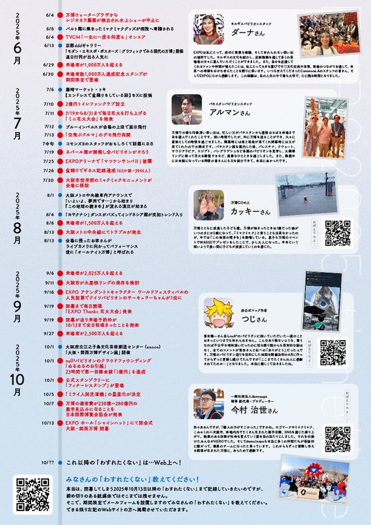 大阪・関西万博の開催が決定した2018年11月24日を起点に、閉幕までの記録と万博をつくってきた人々の記録を年表形式で残しました。SNS万博とも評されたほど、ネットの世界も賑わっていました。万博の出来事と、SNSやその他の話題、そして万博に色濃く関わってきた11名の「わすれたくない」も紹介しています。さらに、誌面では紹介しきれないコメントのロングバージョンをdemo!expoのNOTEで読める設計も作りました。誌面に表示のQRコードをから遷移できる仕組みになっています。