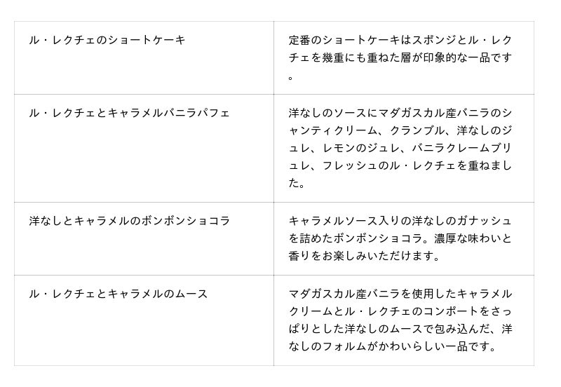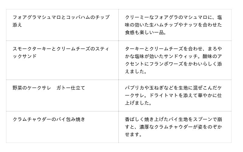 都会の中でも自然豊かな御殿山で、四季の移ろいを感じながらお楽しみいただく東京マリオットホテルのアフタヌーンティーのフェスティブシーズンの主役は、2023年の発売以来多くのお客様からご好評をいただいている”ル・レクチェ”。高い糖度ととろけるような果肉や芳醇な香りが特徴的で、幻の洋なしとも呼び声高い冬が旬のフルーツです。そこに、相性抜群の香り高いマダガスカル産・パプアニューギニア産の2種のバニラと香ばしく濃厚に甘い自家製キャラメルを合わせ、冬ならではのマリアージュをご堪能いただけるスイーツをご用意しました。スイーツでは定番のショートケーキをはじめ、マダガスカル産バニラビーンズを使用したキャラメルをムースやスコーンなど多彩なアイテムに取り入れ”ル・レクチェ”との絶妙な味わいをご堪能いただけます。セイボリーはフォアグラのマシュマロやターキーのサンドウィッチなど華やかな4品が並びます。