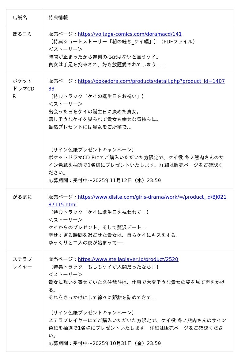 店舗ごとに購入特典をご用意しているほか、ポケットドラマCD Rとステラプレイヤーにてご購入の方を対象に、冬ノ熊肉さんのサイン色紙が抽選で1名様に当たるプレゼントキャンペーンのほか、各店舗にて「誘惑悪魔 Vol.1 ~ドSインキュバス・ケイの嘘~」のセールも開催中です。