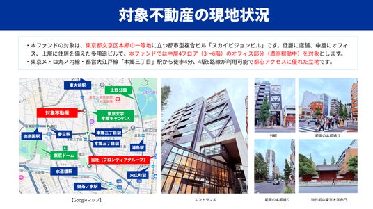 本ファンドは、東京都文京区本郷に位置する「スカイビジョンビル」中層4フロアを対象としたオフィス運用プロジェクトです。文教・医療・ビジネスが融合する本郷エリアにおいて、安定的な収益性が見込まれる資産を選定いたしました。