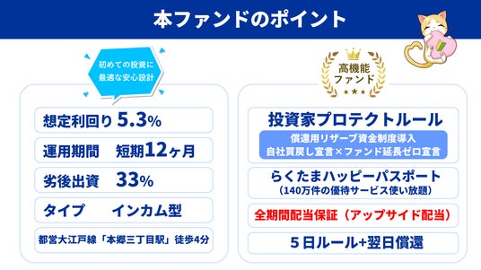 本ファンドでは、「劣後出資比率33%」「全期間配当保証(早期償還時はアップサイド配当)」「5日ルール+翌日償還」を採用するとともに、「投資家プロテクトルール」および「償還用リザーブ資金制度」を導入し、投資家保護を重視した堅実な運用体制を構築しております。