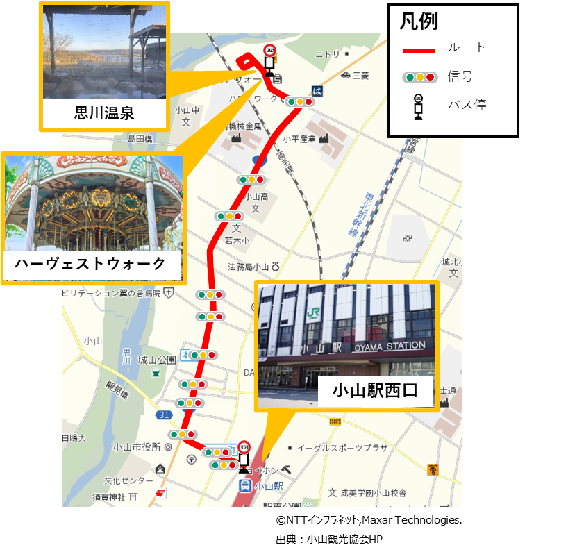 ※停車するバス停は、小山駅西口、ハーヴェストウォーク、小山温泉思川の3つです。