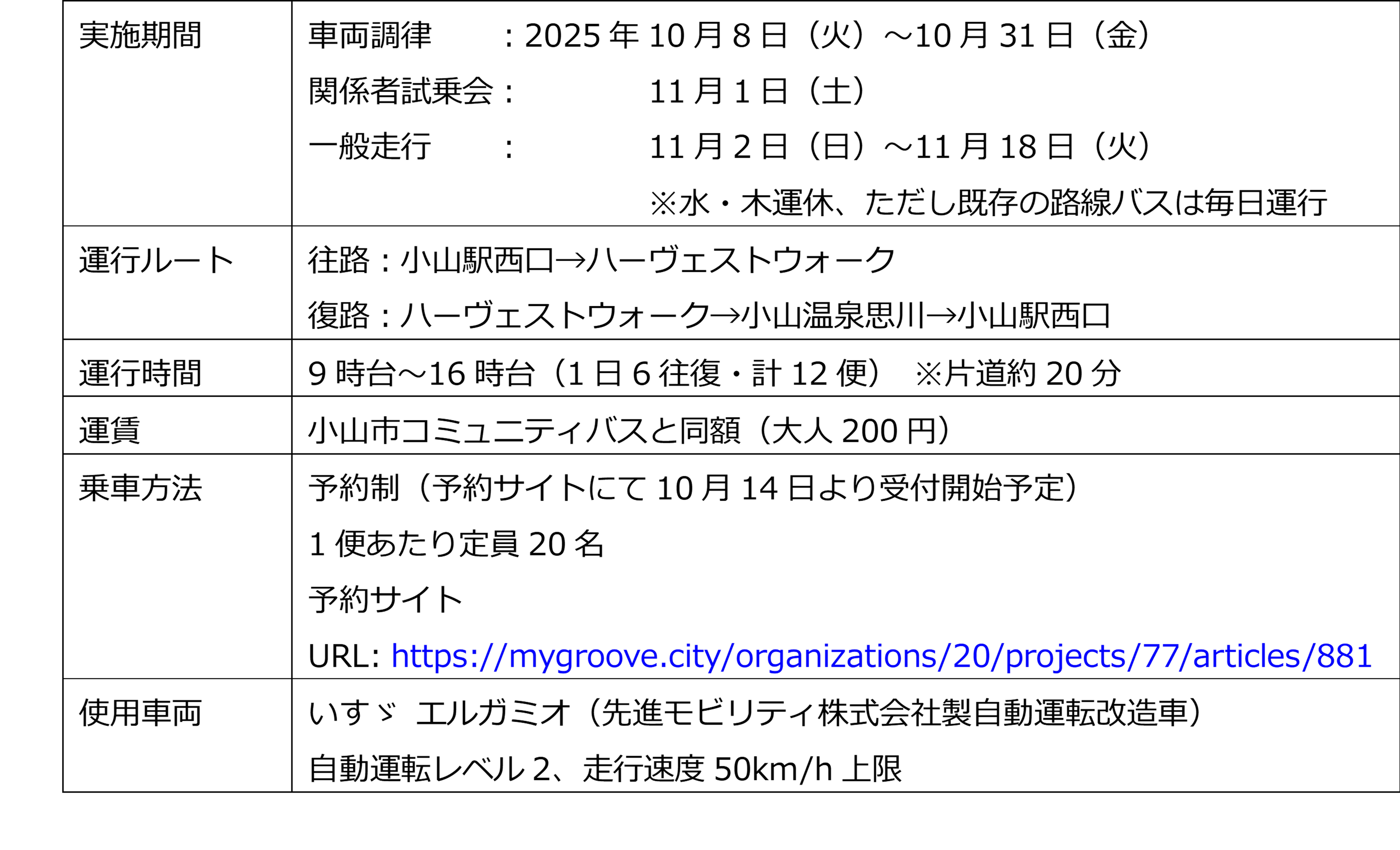 実証実験に先立ち、2025年11月1日(土)の14:30から、ハーヴェストウォーク内バス停近く(スーパービバホーム小山店駐車場一角)にて、出発式を執り行う予定です。さらに、同日、10:00から14:00に、ハーヴェストウォークにて周知イベントを行う予定です。※出発式ご出席を希望のメディアの方は下記までご連絡ください。