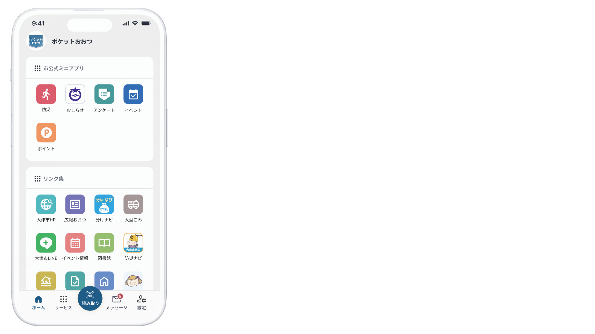 また、大津市が既に提供している各種デジタル行政サービスやサイトへの導線もアプリ内に設けています。(大津市HP、広報おおつ、分けなび、大型ごみ申請、大津市LINE公式アカウント、図書館、防災ナビ、防災ポータル、電子申請サービス、くらしの手続きガイド、とも☆育、検診予約、未るみる、広報課X、市民通報システムなど)
