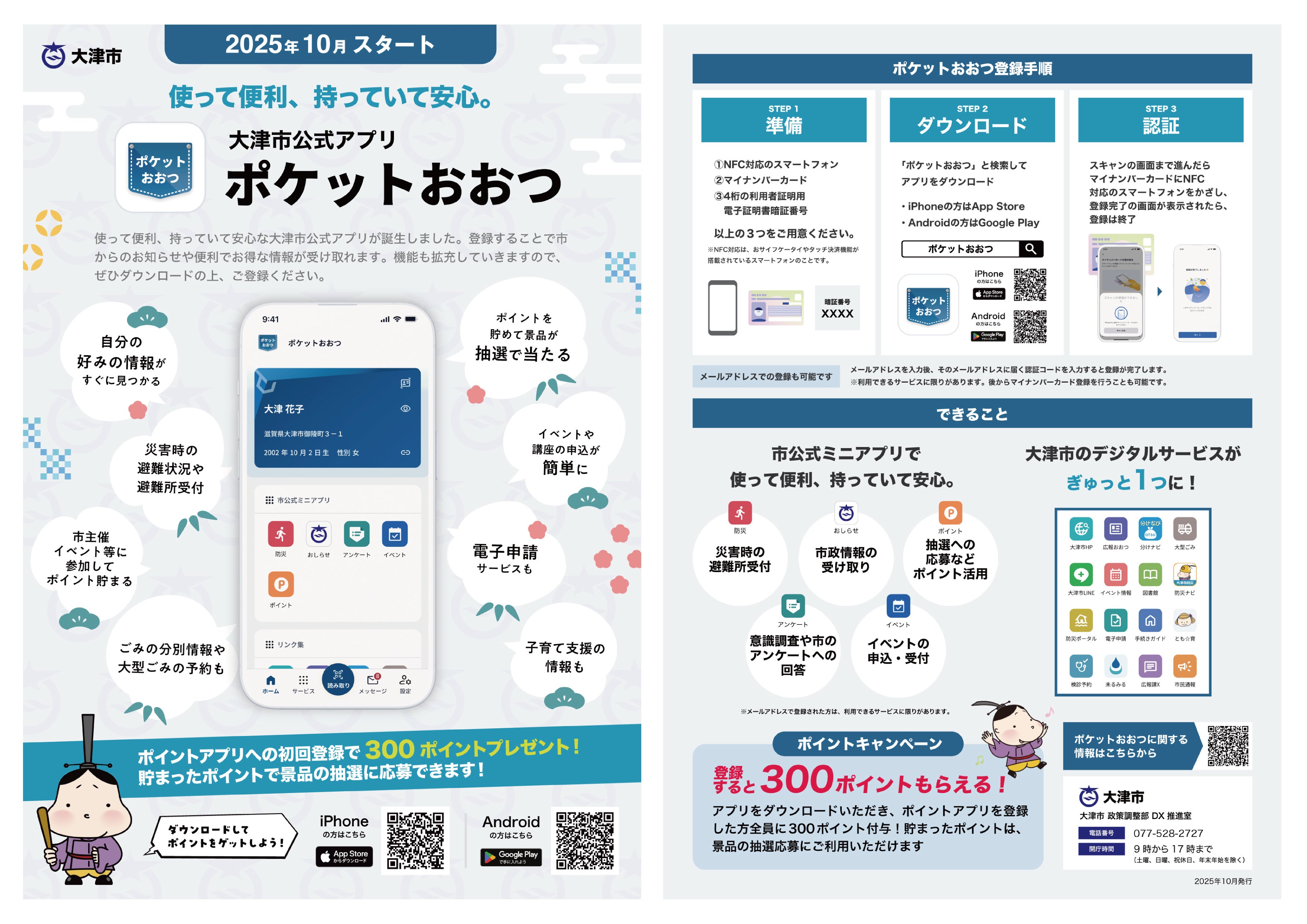 当社は「ポケットおおつ」の提供にあたり、アプリ「ポケットサイン」のOEM供給に加えて、住民向けの案内チラシ作成も行いました。アプリの機能や登録方法、ポイントキャンペーンの内容をわかりやすくまとめることで、市民がスムーズに利用を始められるよう協働で取り組んでいます。