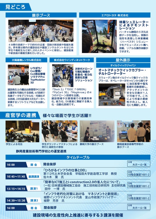 建設現場の効率化・省力化につながる新技術のブース展示と併せて、建設現場の生産性向上の推進に関する講演も開催いたします。