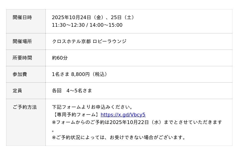 【開催場所】クロスホテル京都1Fロビーラウンジ【開催期間】2025年10月17日(金)~11月7日(金)