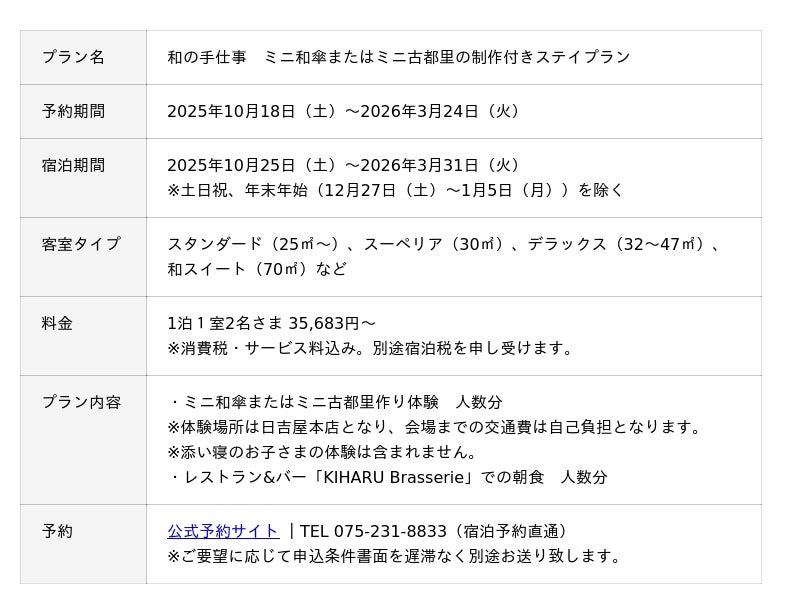 日吉屋本店での「ミニ和傘づくり体験」または「ミニ古都里づくり体験」が付いた宿泊プランをご用意しました。実際に職人が和傘を作る工程を見学することもできる、大人の修学旅行におすすめのプランです。本プランの特典として、和紙のカラーが追加となり、柄和紙による二重張りのカッパ(和傘の頭部)が選べます。