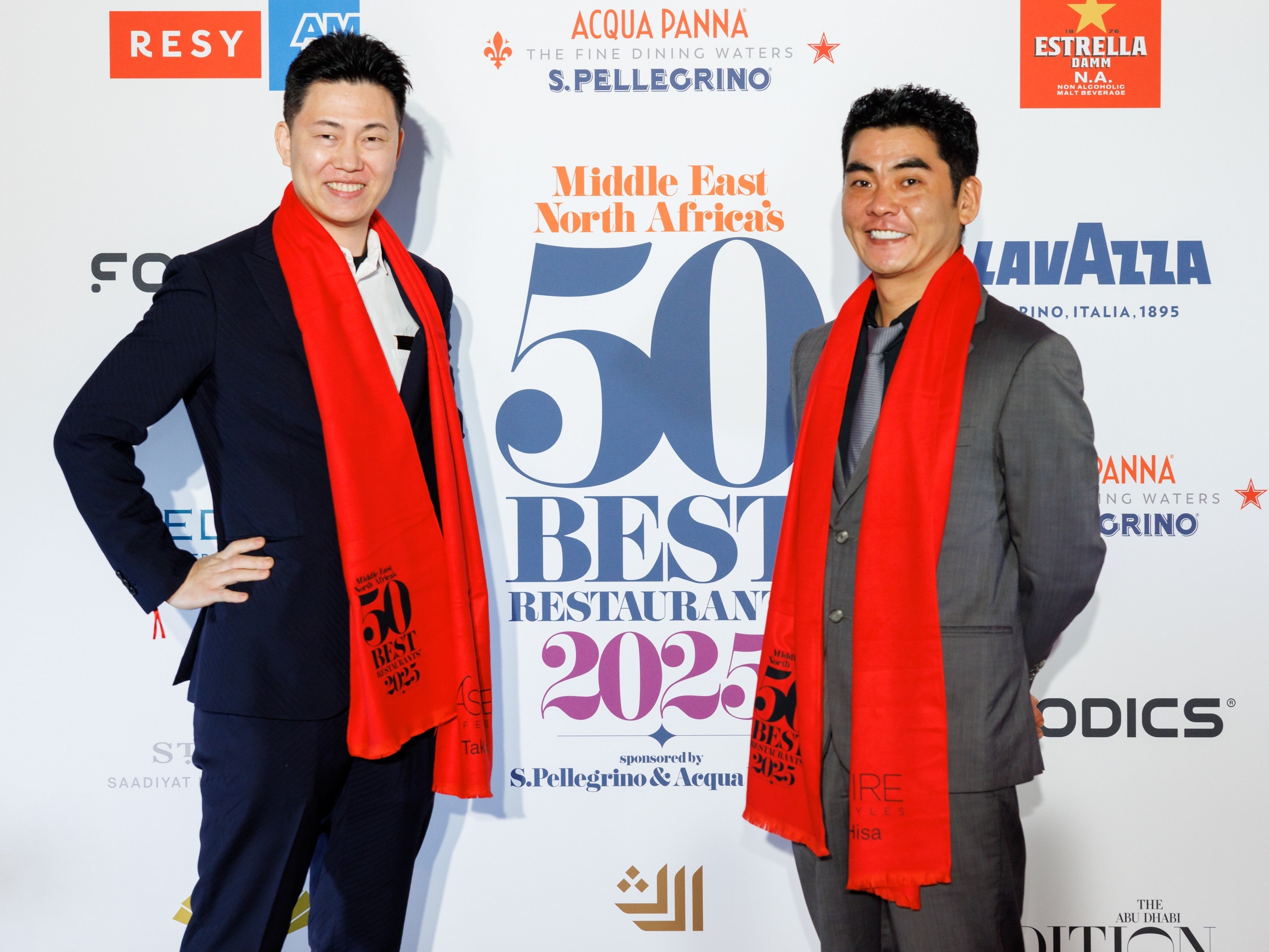 「MENA's 50 Best Restaurants 2025」授賞式にて、受賞シェフに贈られる赤いスカーフを肩にかける、鮨シェフ・行方 崇(左)と和牛シェフ・上田 寿夫(右)