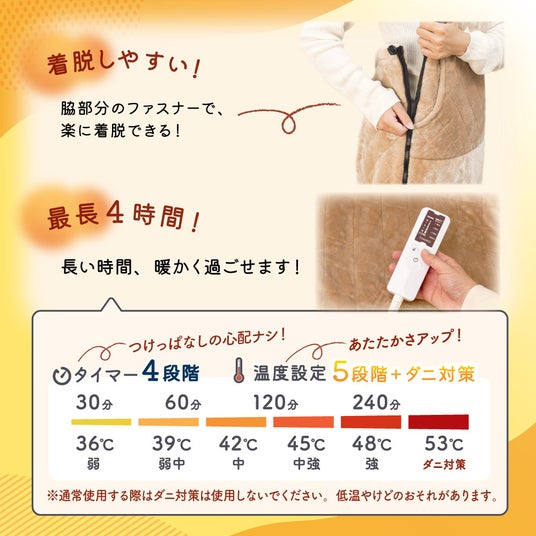 ヒーター温度は 5段階(約36度/約39度/約42度/約45度/約48度)+ダニ対策モード(約53度)で設定が可能。
