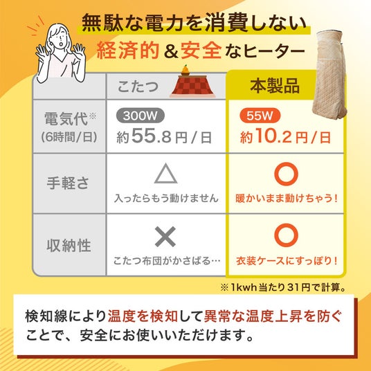 消費電力は55Wで一般的なこたつ(300W)と比べても約1/5の電気代で省エネ。