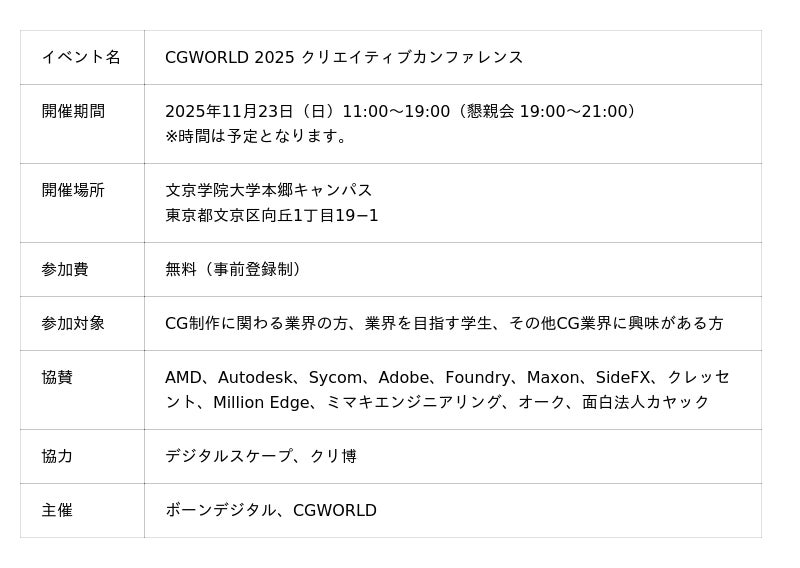 株式会社ボーンデジタル(本社:東京都千代田区、CEO:新和也、URL:https://www.borndigital.co.jp/)は11月23日(日)にCG・映像クリエイターのためのカンファレンスイベント『CGWORLD 2025 クリエイティブカンファレンス』を文京学院大学で開催いたします。