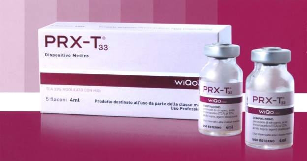 PRX-T33を使用したピーリング治療。高濃度のトリクロロ酢酸(TCA)、低濃度の過酸化水素、コウジ酸が含まれた薬剤を塗布することで、真皮深層まで浸透してコラーゲン生成を促進し、ハリ・ツヤ・弾力の向上、小じわなどの肌質改善効果が期待できます。