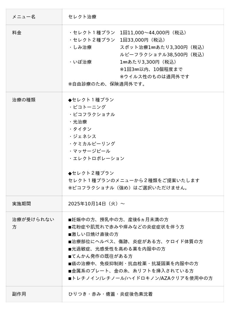 ボトックスやヒアルロン酸、最新レーザーを駆使した切らないアンチエイジング治療を提供する麻布ビューティクリニック(所在地:東京都港区六本木7丁目8-6)は、新たに『セレクト1種プラン』・『セレクト2種プラン』・『しみ/いぼ治療』の提供を10月14日(火)より開始いたします。