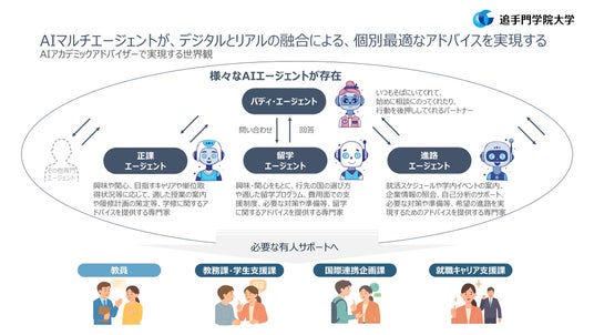 本機能は、日本で初めて大学独自アプリにマルチエージェント構成の学生向けAIアドバイザーを実装するもので(※1)、統合データベースと呼ばれる個々の学修データや行動データ、就職情報などを集約したデータベースを基盤に、生成AIが学生一人ひとりに最適化された学修支援を提供します。