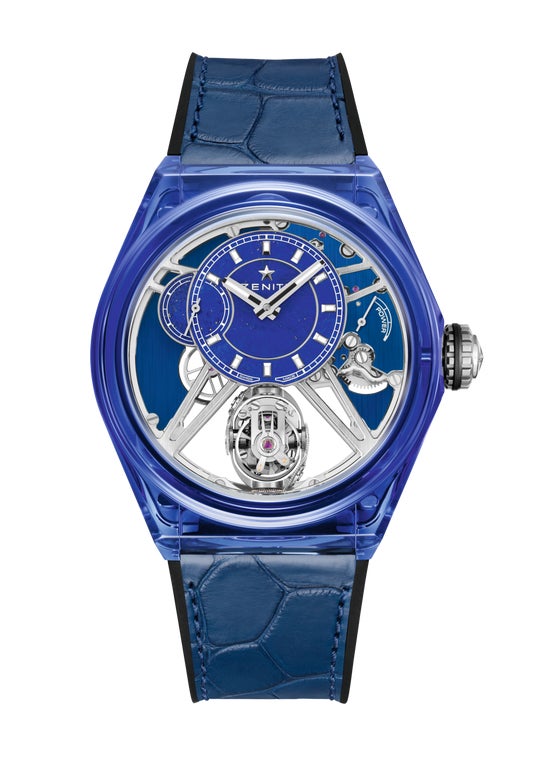 限定モデルゼニス「デファイ ゼロ G サファイア」は、フォールディングバックル付きの一体型ブルーアリゲーターレザーストラップを備えています。