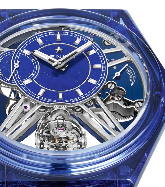 特長:フルブルーサファイアケース。全体をスケルトン化したムーブメント:エル・プリメロ 8812。調速機構を水平に保つ「グラビティ コントロール」ジャイロスコープモジュール