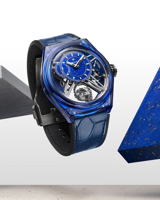 2021年、ゼニスはこの革新的なキャリバーを再解釈し、ムーブメント全体の再設計を行いました。新たな機構では、よりオープンで見やすい表示と透明なサファイア ケースを採用し、魅惑的なメカニズムをあらゆる角度から眺められるようになりました。今回、創業160周年を記念し、ゼニスは新たにディープクリアブルーとトランスペアレントのサファイア製46mmケースを備えた2つの「デファイゼロG」限定モデルを発表します。ミドルケース、ベゼル、ケースバックは、ダイヤモンドに匹敵する硬度と耐傷性を持つサファイアのブロックから切り出して作られています。