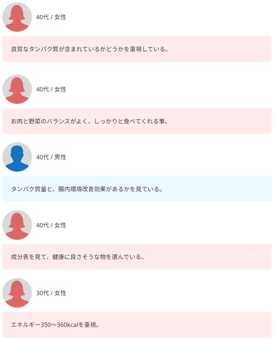 栄養バランスを意識してフードを選んでいる飼い主さんからは、お肉や野菜の組み合わせ、腸内環境への配慮など健康を重視する傾向が見られました。