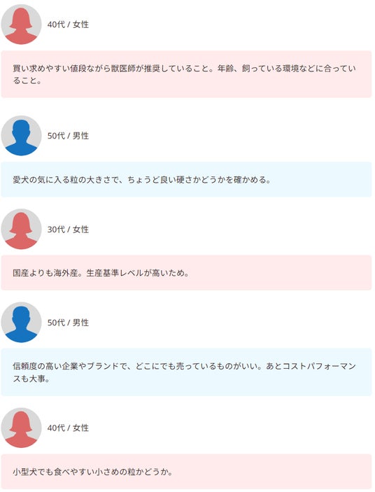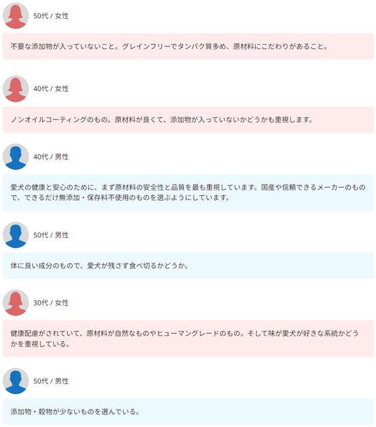 - 無添加・国産・ヒューマングレードなど“安全性”にこだわって選ぶという声も多数あった。