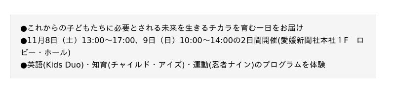 愛媛県での初開校を記念!参加無料の親子で楽しめるイベントを愛媛新聞社で開催9歳までに本当に必要な教育がわかる「自分力教育」親子イベントを開催。英語(Kids Duo)、知育(チャイルド・アイズ)、運動(忍者ナイン)のプログラムが愛媛新聞社に集結