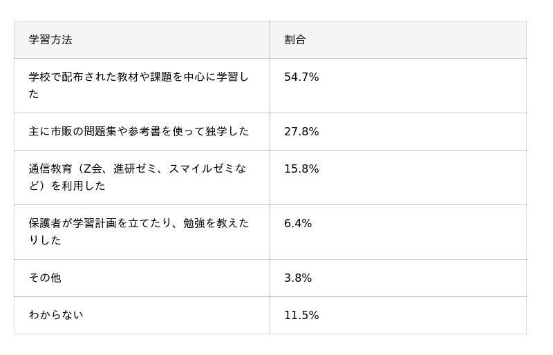 その結果、最も多かった回答は「学校で配布された教材や課題を中心に学習した」で、過半数となる54.7%に達しました。次点の「主に市販の問題集や参考書を使って独学した(27.8%)」と合わせると8割以上となり、通信教育や保護者の直接指導といったイメージを抑え、最も身近な教材で対策を進める家庭が大多数であるという実態が明らかになりました。