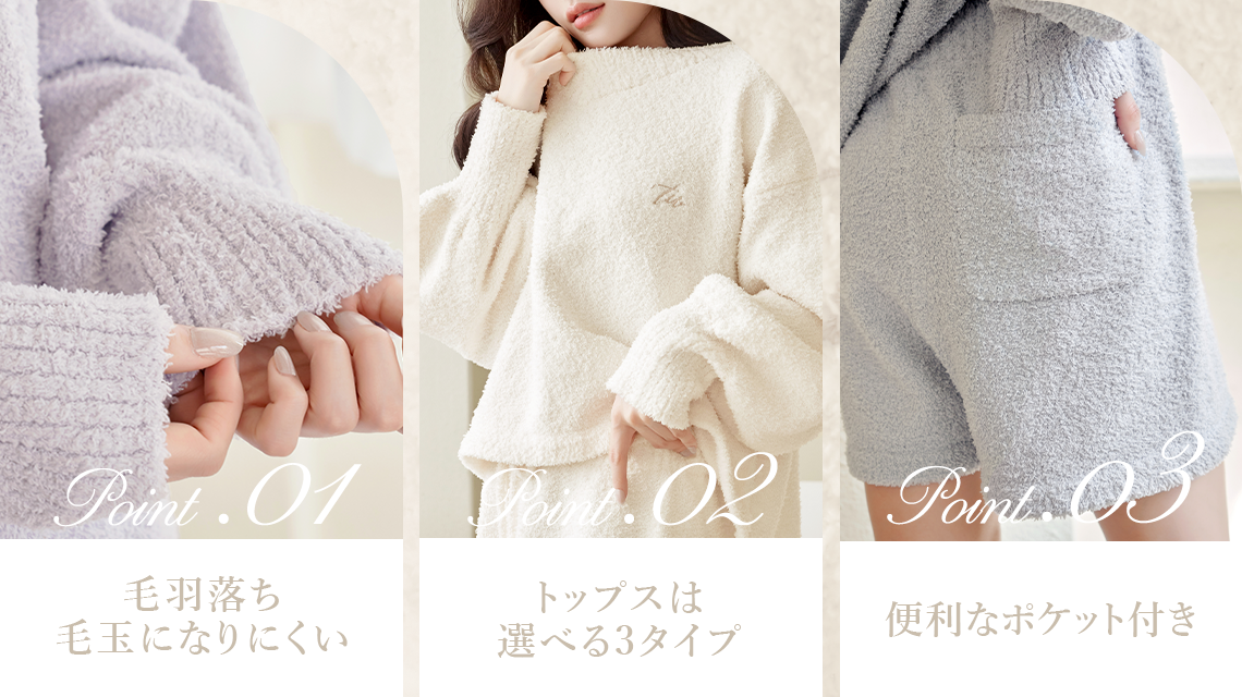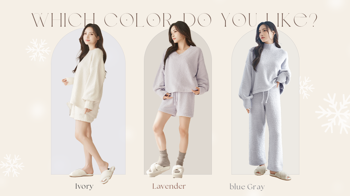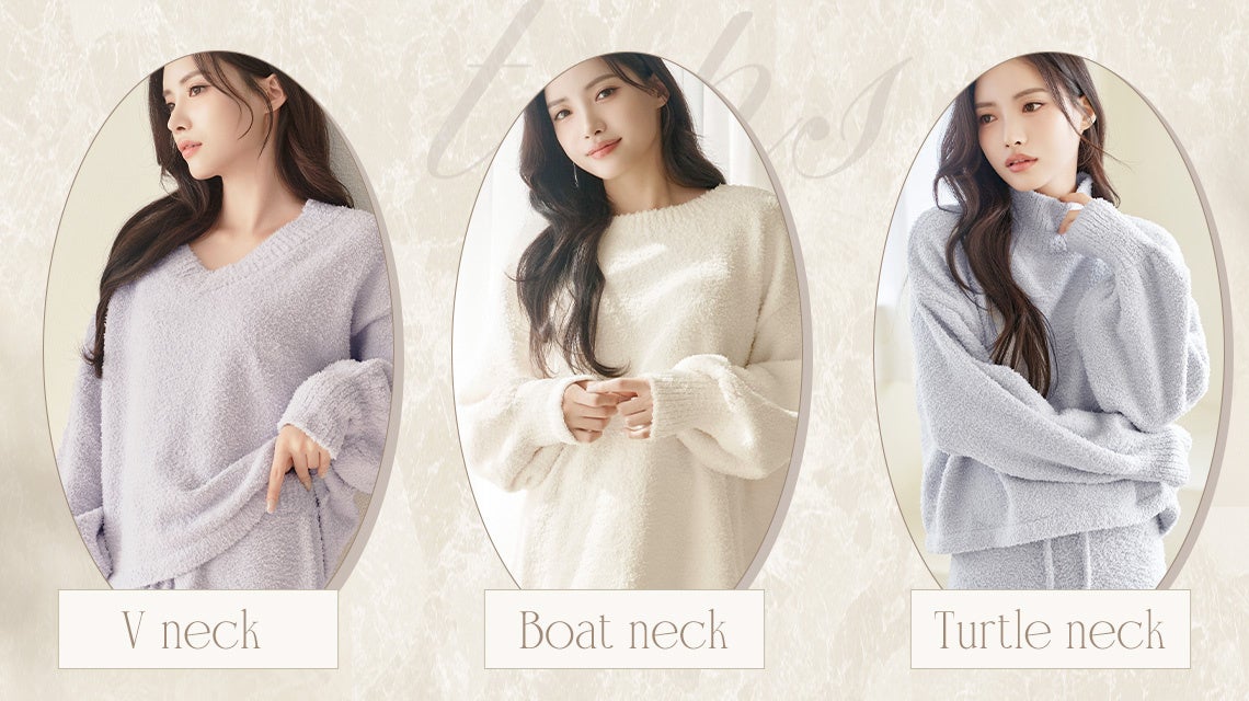 落ち着きのあるアイボリー、ラベンダー、ブルーグレーの3色展開で、おうちコーデも上品に仕上がります。