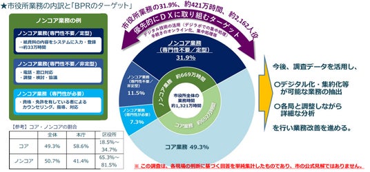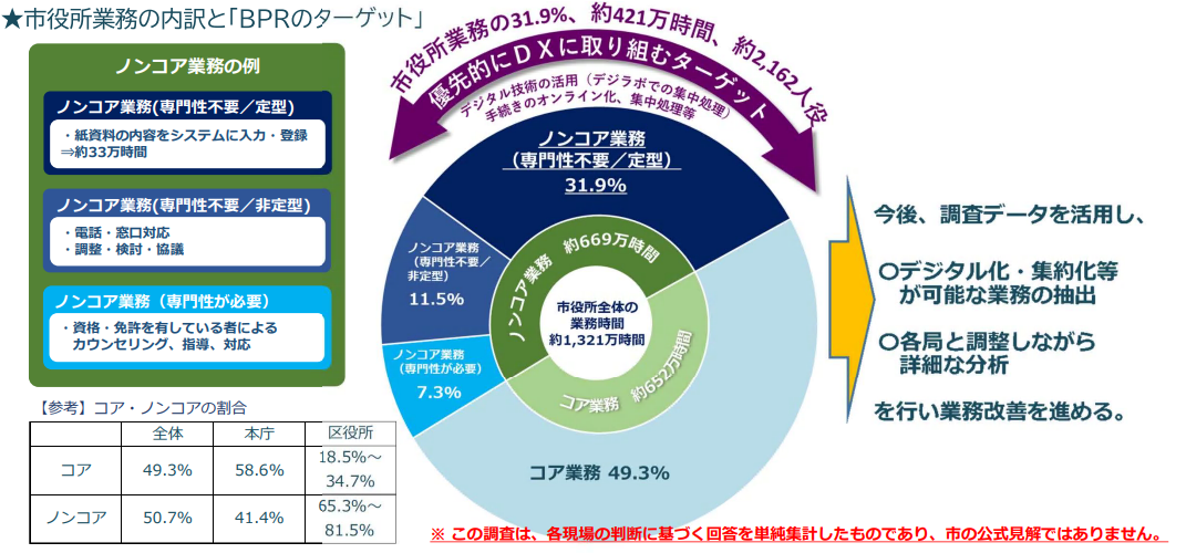 令和3年度に実施した全庁的な業務量調査では、多くの職員が、専門性を必要としない定型的なノンコア業務(ノンコア業務)に膨大な時間を費やしている実態が明らかになりました。その時間は、全庁で年間約421万時間にも及び、市役所業務全体の31.9%に相当します。この状況を打開するため、北九州市では「DX・AI戦略室」を中心に、ノンコア業務を対象とした徹底的な業務改革(BPR)とDXによる業務変革を加速させています。