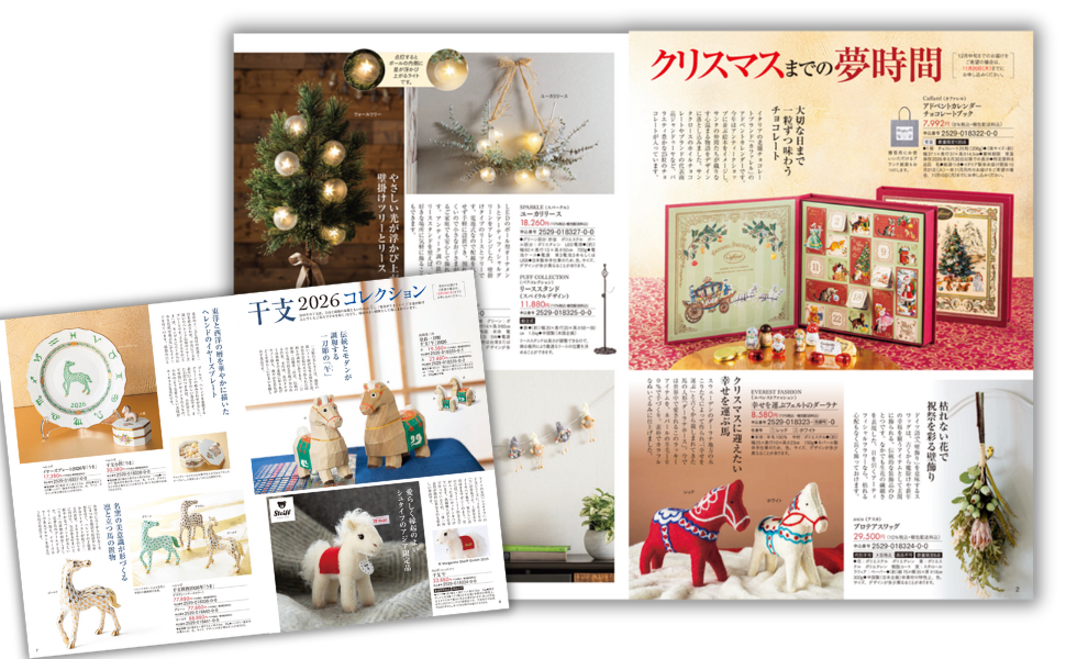 インテリアカタログ『HOME』では、「クリスマスまでの夢時間」、「干支2026コレクション」、「お正月飾り」など、年末年始の住空間をおしゃれに演出する品を集めたインテリア企画が目白押し。この冬を暖かく過ごすための家電やラグ、ルームウエアなどを紹介する「暖房&ファブリック特集」も要チェック。