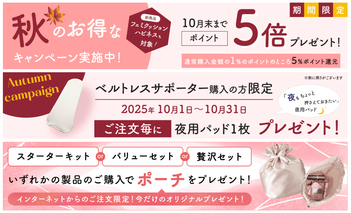 三井メディカルジャパンの公式通販サイト(https://urogyne.jp/)では、2025年10月1日~31日の期間限定で「秋のポイント5倍キャンペーン」を実施しております。毎年恒例のキャンペーンであり、これまでの「フェミクッション」に加えて今年は初めて「フェミクッションハピネス」が追加されました。